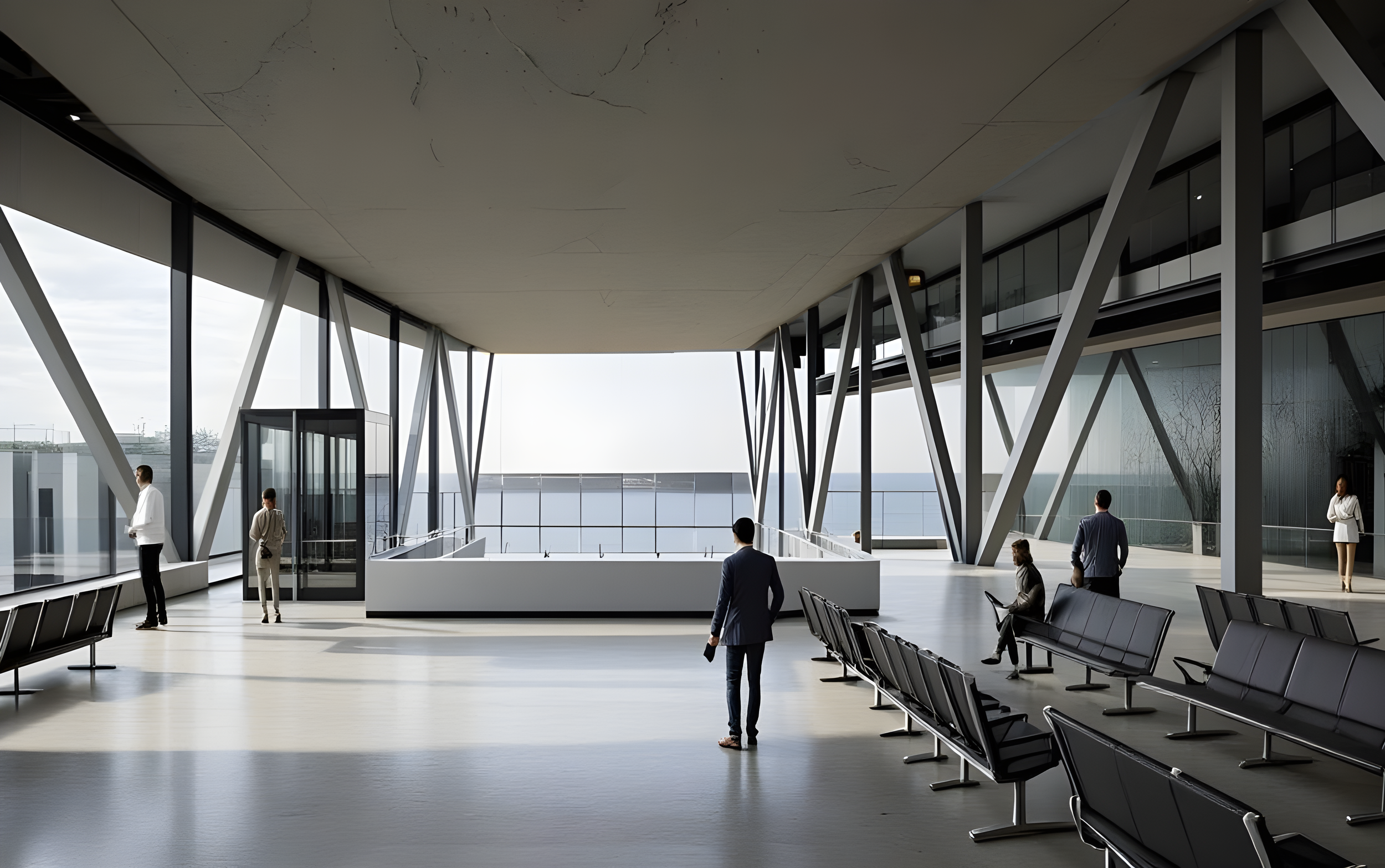 The proposal for this ferry passenger terminal is conceived as an elongated complex that rises from the ground to form a floating box above. The program is organized into two volumes, the main one runs parallel to the dock, and the other spins off it. These structures rise from the ground in opposite directions to create a green promenade as an artificial landscape. The building separates from the ground at an angle, adding a sense of lightness to the elongated plan as well as creating a covered open public space. The secondary mass intends to address the future development of the city with its skewed façade oriented towards the new development. the layout unifies the east and west sides by picking up the pedestrian circulation in the area, extending a corridor on the south to facilitate further expansion. The interior of the angled prism is defined by a series of terraces that offer direct contact between levels, allowing the diagonal roof to hover above.