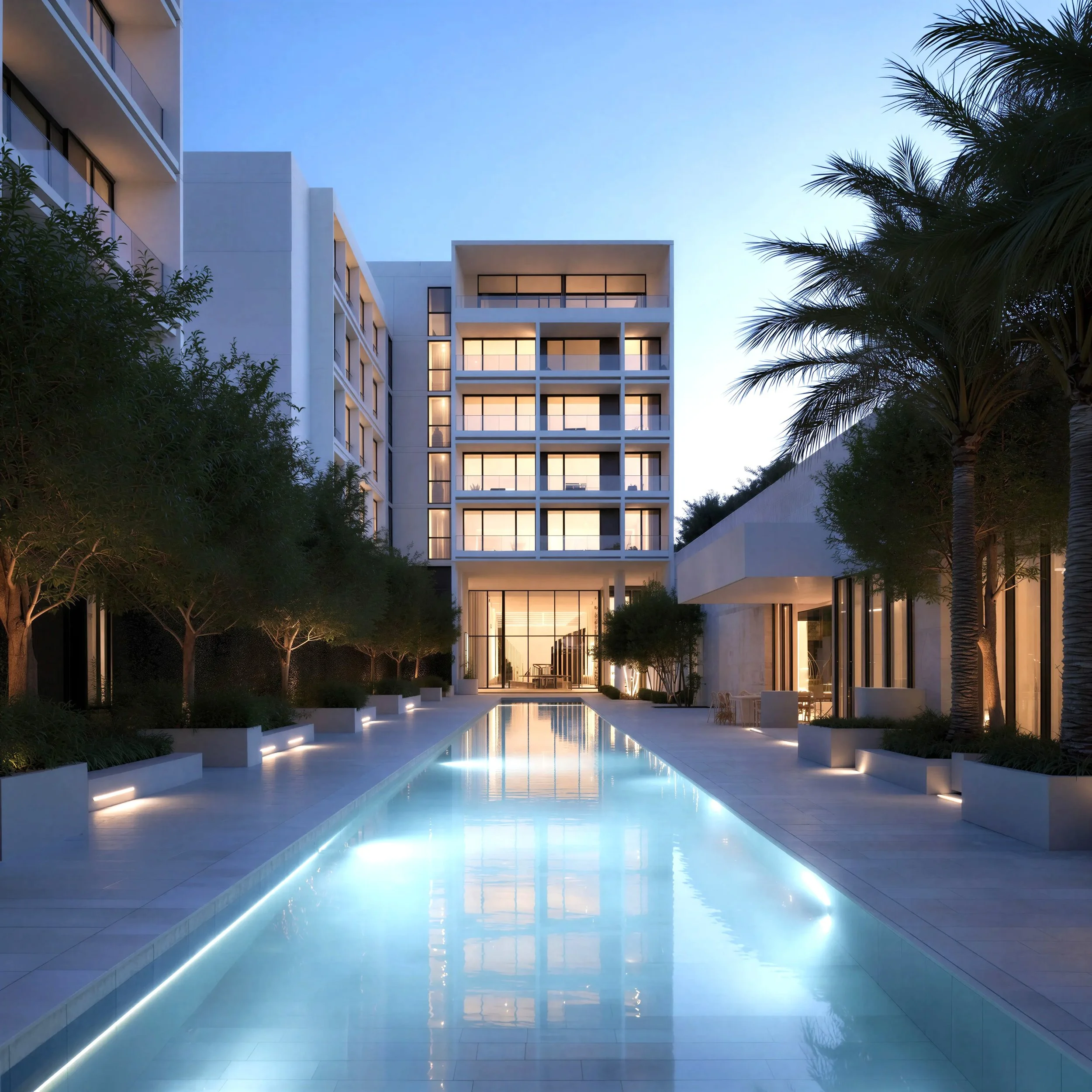 Beach Hotel is an L shape complex that is composed of several buildings of different heights up to seven stories. An elongated infinity pool, flanked by a restaurant on one of the sides is located in the principal courtyard.